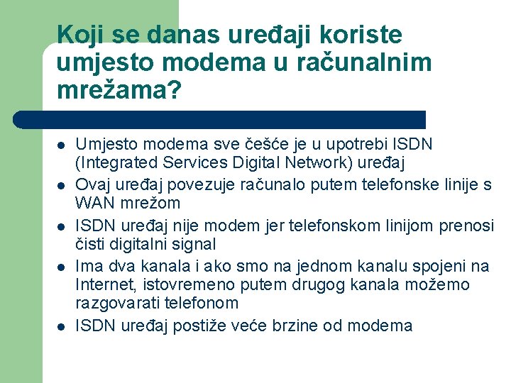 Koji se danas uređaji koriste umjesto modema u računalnim mrežama? l l l Umjesto modema sve češće je u upotrebi ISDN (Integrated Services Digital Network) uređaj Ovaj uređaj povezuje računalo putem telefonske linije s WAN mrežom ISDN uređaj nije modem jer telefonskom linijom prenosi čisti digitalni signal Ima dva kanala i ako smo na jednom kanalu spojeni na Internet, istovremeno putem drugog kanala možemo razgovarati telefonom ISDN uređaj postiže veće brzine od modema