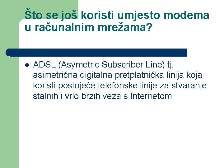 Što se još koristi umjesto modema u računalnim mrežama? l ADSL (Asymetric Subscriber Line) tj. asimetrična digitalna pretplatnička linija koristi postojeće telefonske linije za stvaranje stalnih i vrlo brzih veza s Internetom