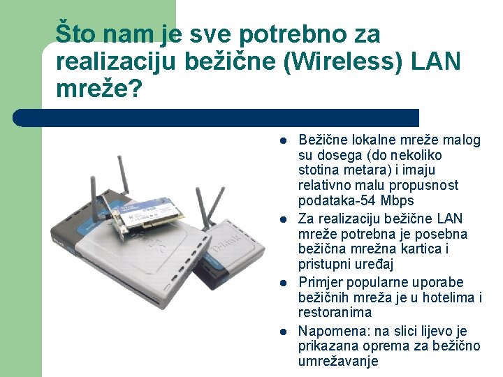 Što nam je sve potrebno za realizaciju bežične (Wireless) LAN mreže? l l Bežične lokalne mreže malog su dosega (do nekoliko stotina metara) i imaju relativno malu propusnost podataka-54 Mbps Za realizaciju bežične LAN mreže potrebna je posebna bežična mrežna kartica i pristupni uređaj Primjer popularne uporabe bežičnih mreža je u hotelima i restoranima Napomena: na slici lijevo je prikazana oprema za bežično umrežavanje