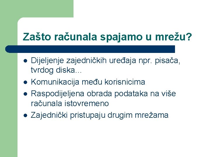 Zašto računala spajamo u mrežu? l l Dijeljenje zajedničkih uređaja npr. pisača, tvrdog diska… Komunikacija među korisnicima Raspodijeljena obrada podataka na više računala istovremeno Zajednički pristupaju drugim mrežama