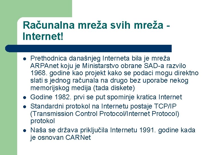 Računalna mreža svih mreža Internet! l l Prethodnica današnjeg Interneta bila je mreža ARPAnet koju je Ministarstvo obrane SAD-a razvilo 1968. godine kao projekt kako se podaci mogu direktno slati s jednog računala na drugo bez uporabe nekog memorijskog medija (tada diskete) Godine 1982. prvi se put spominje kratica Internet Standardni protokol na Internetu postaje TCP/IP (Transmission Control Protocol/Internet Protocol) protokol Naša se država priključila Internetu 1991. godine kada je osnovan CARNet