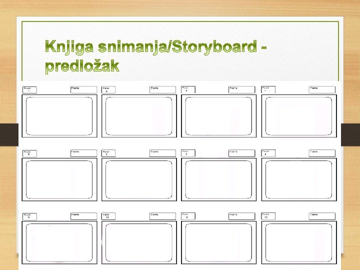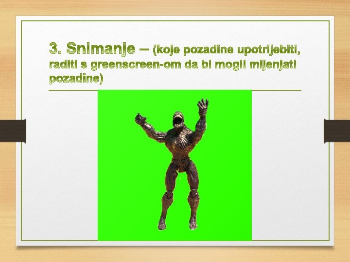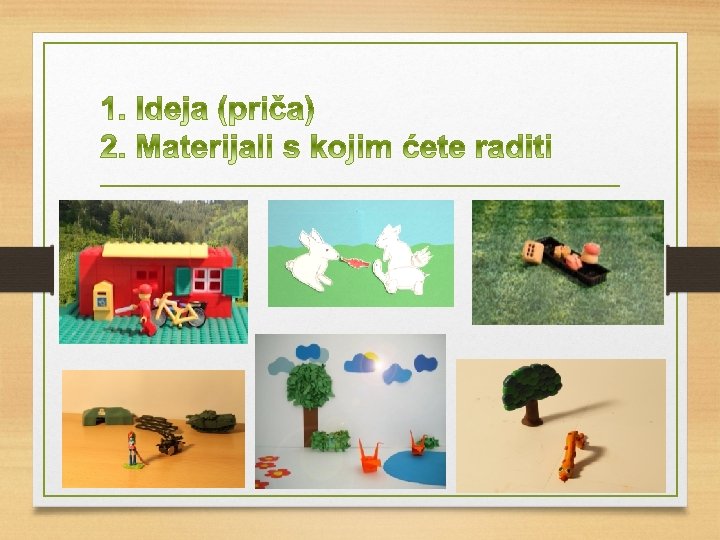 Priprema za Stop motion animaciju v Prema ideji (priči) napraviti knjigu snimanja na predlošku (primjer u prezentaciji) v Pripremiti potrebnu opremu za snimanje v Pripremiti objekte i scene (pozadine)