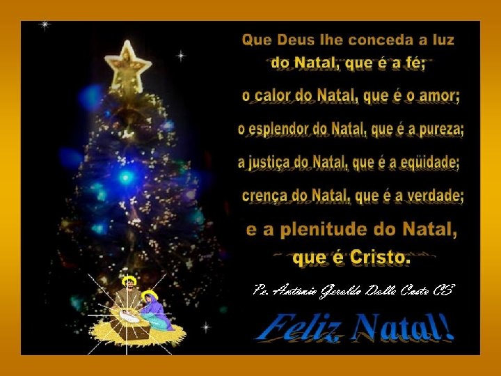 É uma lição de Humildade e Pobreza: Deus feito criança. . . numa gruta. . . num lugar perdido no tempo. . . - Deus se fez pequeno. . . E nós? É um apelo de Amor e Paz: - DEUS "tendo amado os seus enviou-nos o seu próprio filho": CRISTO: fruto do amor de Deus para com os homens. . . - ANJOS: "Glória a Deus. . . e PAZ na terra. . . "