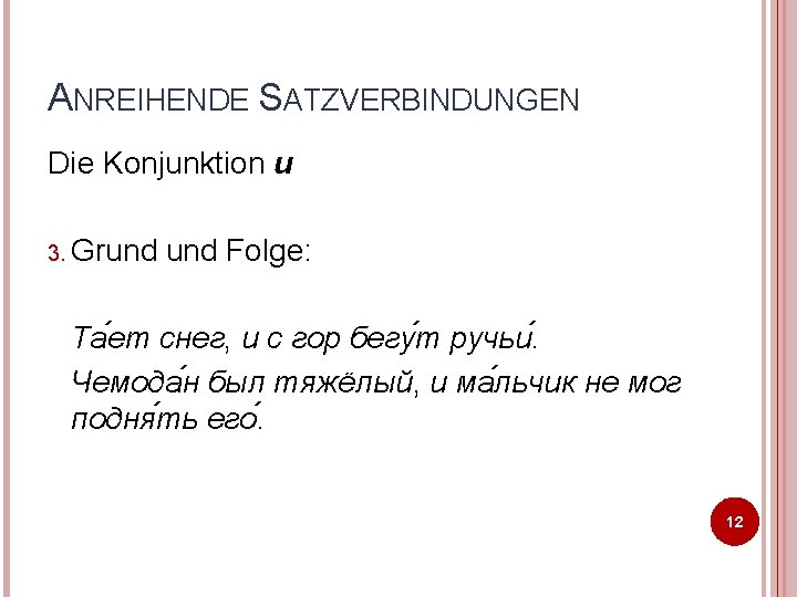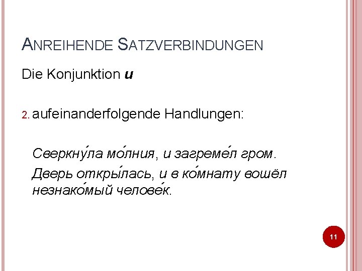 ANREIHENDE SATZVERBINDUNGEN Die Konjunktion и 1. gleichzeitig vor sich gehenden Handlungen: Звеня т трамва и, и гудя т автомоби ли. Свети ло со лнце, и шел дождь. 10