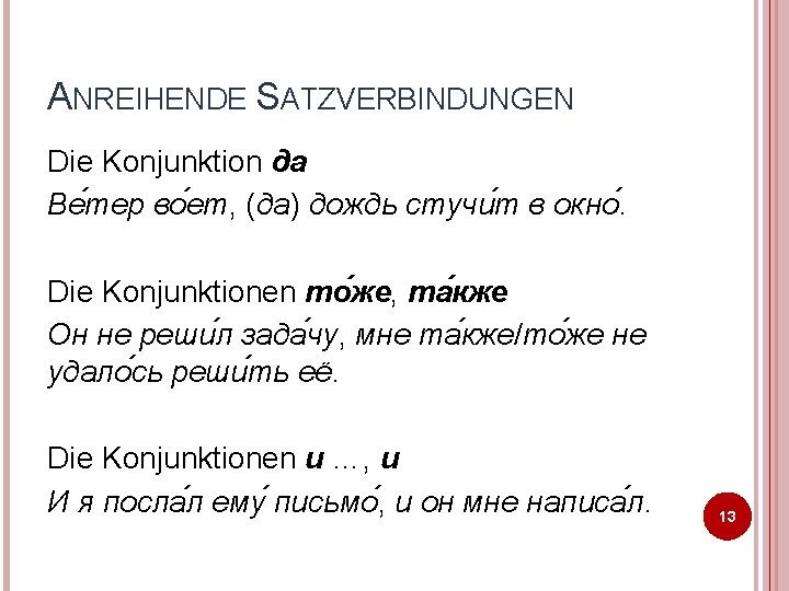 ANREIHENDE SATZVERBINDUNGEN Konjunktionen и (und) да (ugs. und) и …, и (sowohl … als auch) ни. . . , ни (weder … noch) то же, та кже (auch, ebenfalls) 9