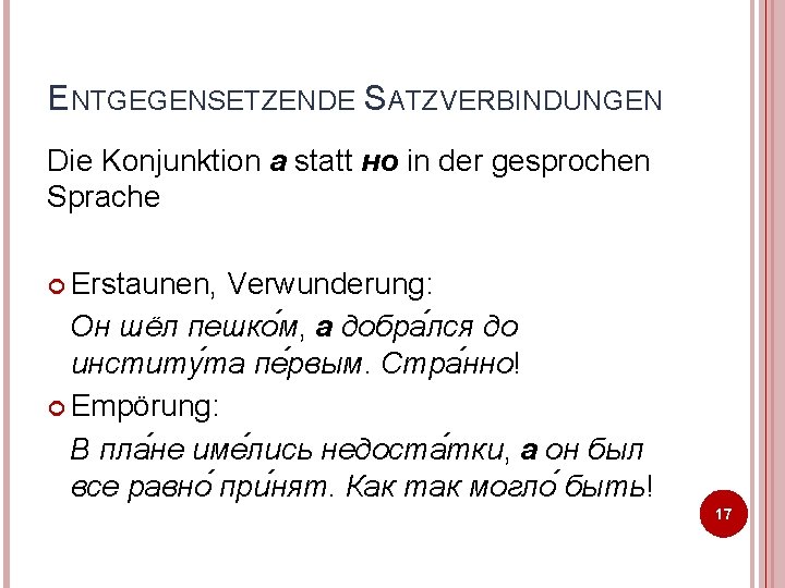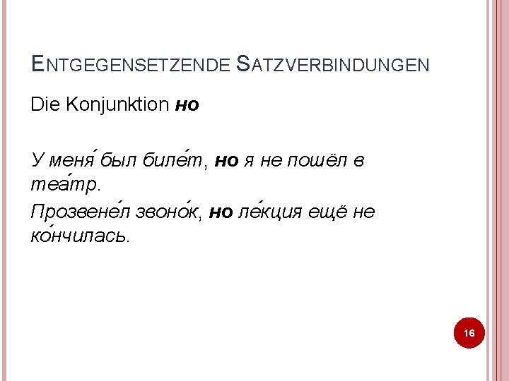 ENTGEGENSETZENDE SATZVERBINDUNGEN Konjunktionen но (jedoch) a (aber) же (aber, doch, jedoch) одна ко (jedoch, doch) 15