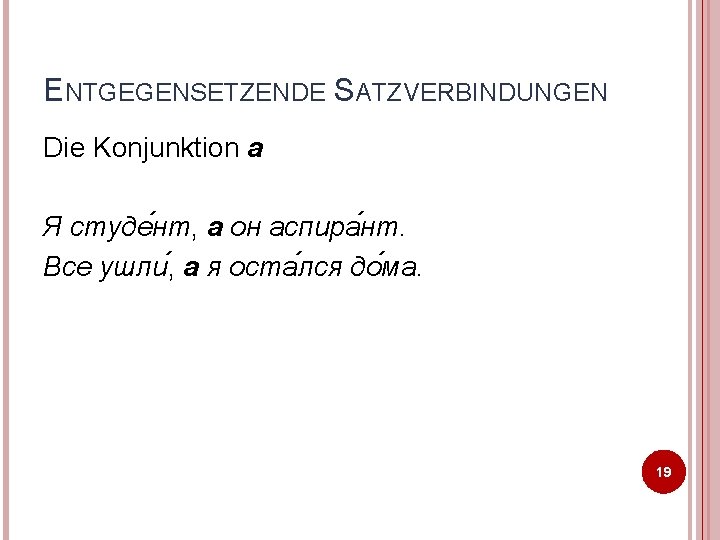 ENTGEGENSETZENDE SATZVERBINDUNGEN Konjunktionen но und и im Vergleich У меня был биле т, Ich hatte eine Eintrittskarte, Прозвене л звоно к, Es läutete, но я не пошëл в теа тр. aber ich ging nicht ins Theater. и я пошëл в теа тр. und ich ging ins Theater. но ле кция ещë не ко нчилась. aber die Vorlesung war noch nicht zu Ende. и ле кция ко нчилась. und die Vorlesung war zu Ende. 18