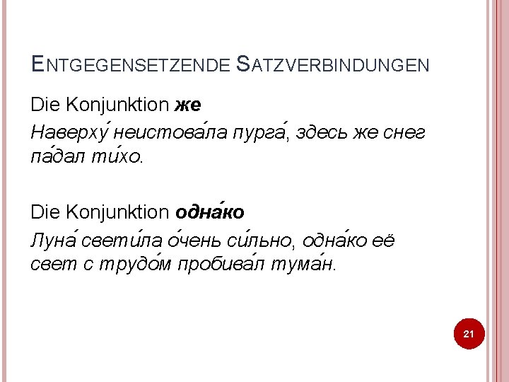 ENTGEGENSETZENDE SATZVERBINDUNGEN Konjunktionen но und а im Vergleich Э та река широ кая, Dieser Fluss ist breit, В его ко мнате темно , In seinem Zimmer ist es dunkel, но переплы ть еë легко. aber es ist leicht, ihn zu durchschwimmen. а та река у зкая. und jener ist schmal. но он не спит. aber er schläft nicht. а в сосе дней ко мнате гори т свет. aber im Nebenzimmer brennt Licht. 20
