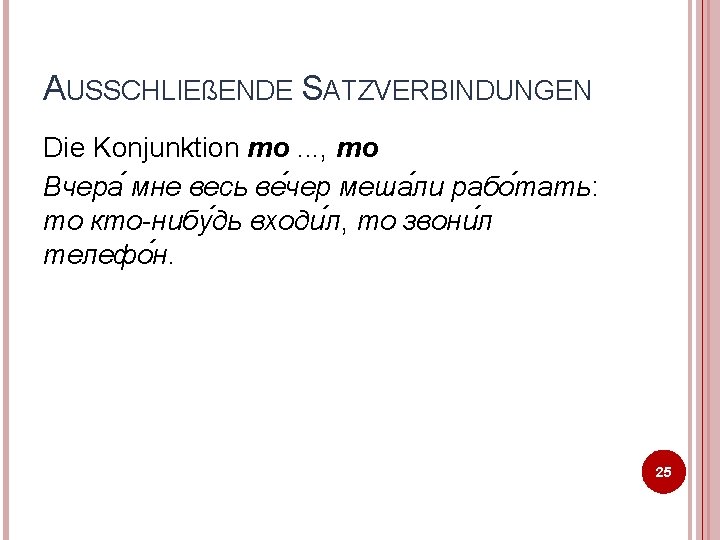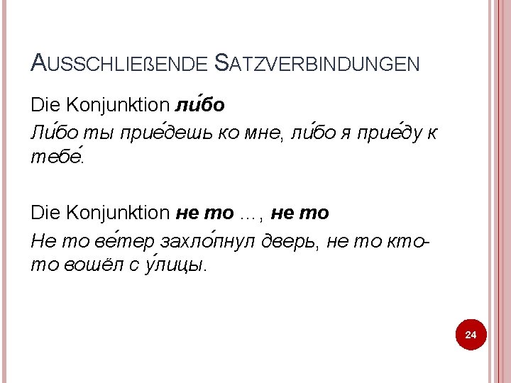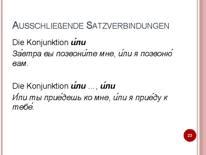 AUSSCHLIEßENDE SATZVERBINDUNGEN Konjunktionen и ли (oder) и ли …, и ли (entweder … oder) ли бо (entweder … oder) не то …, не то (vielleicht …, oder) то …, то (bald … bald) 22