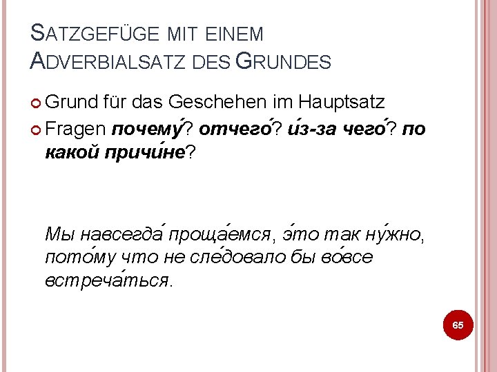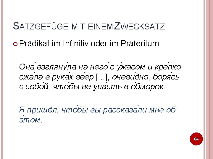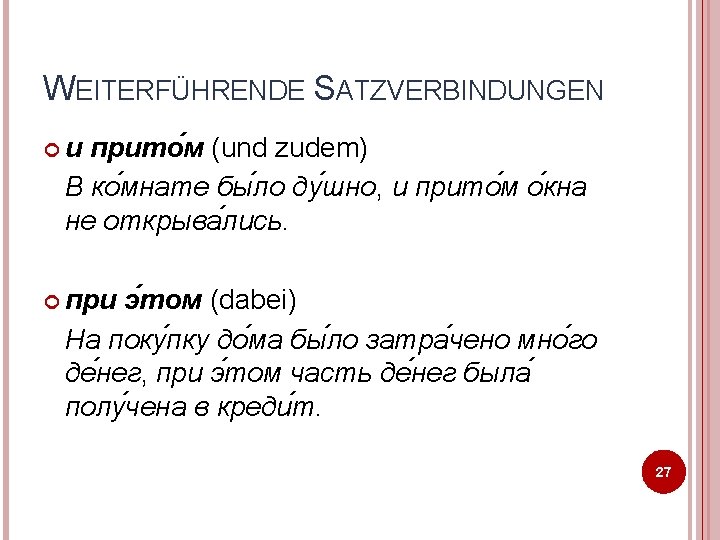 WEITERFÜHRENDE SATZVERBINDUNGEN eine zusätzliche, oft nicht erwartete Information im zweiten Teilsatz то есть (das heißt) Подгото вка к собра нию зако нчена, то есть была утверждена пове стка дня и назна чен докла дчик. 26