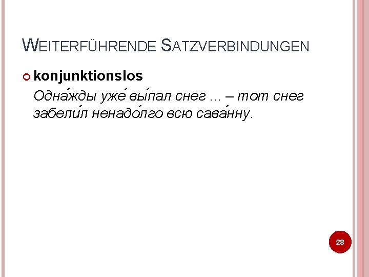 ZUSAMMENGESETZTE SÄTZE OHNE KONJUNKTIONEN einfache Sätze ohne Konjunktionen verbunden Наш огонëк разгора лся, дым поднима лся пря мо кве рху. 29