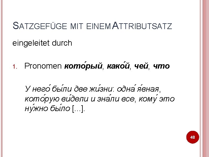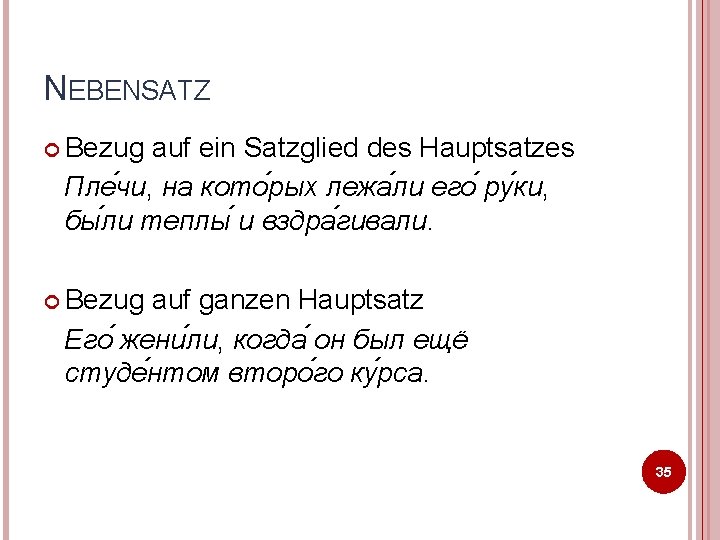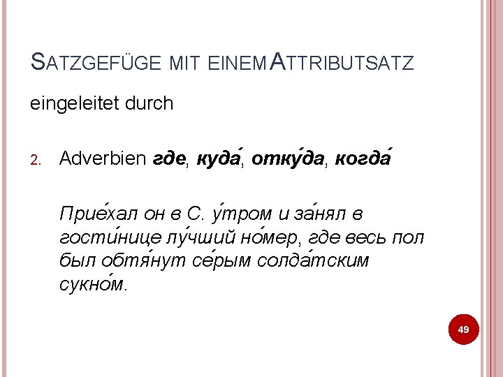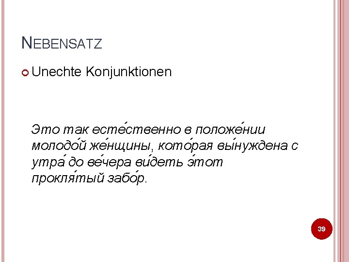 NEBENSATZ Unechte Konjunktionen � Relativpronomen: кто wer, что was, кото рый der, welcher, како й welcher, чей wessen � Relativadverbien: где wo, куда wohin, отку да woher 38