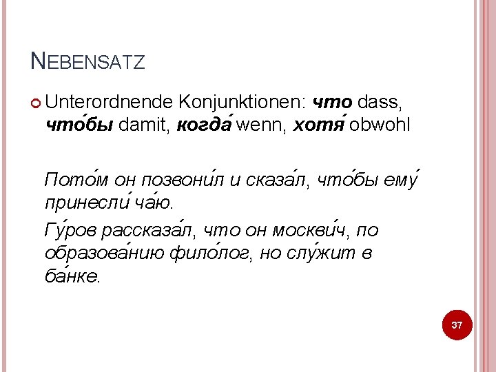 NEBENSATZ Verbindung mit dem Hauptsatz durch unterordnende (echte) Konjunktionen unechte Konjunktionen 36