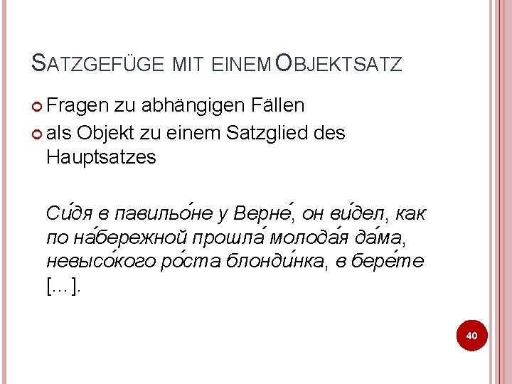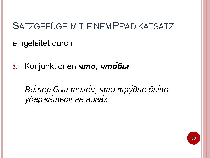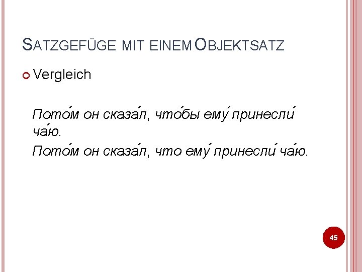 SATZGEFÜGE MIT EINEM OBJEKTSATZ Prädikate im Objektsatz 3. Kurzform von Partizipien des Passivs ска зано – ist gesagt объя влено – ist bekannt gegeben дока зано – ist bewiesen Бы ло объя влено, что собра ние перенесли на пя тницу. 44