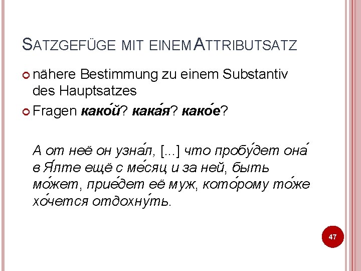 SATZGEFÜGE MIT EINEM SUBJEKTSATZ Fragen zum Nominativ кто? und что? Subjekt zum Prädikat des Hauptsatzes Чу вствовалось, что приближа ется весна. 46