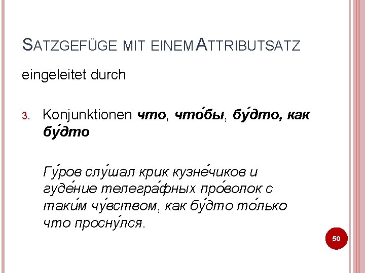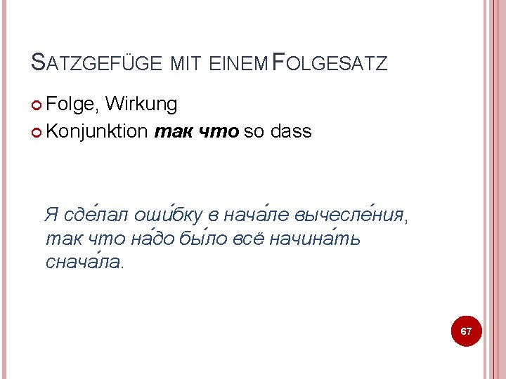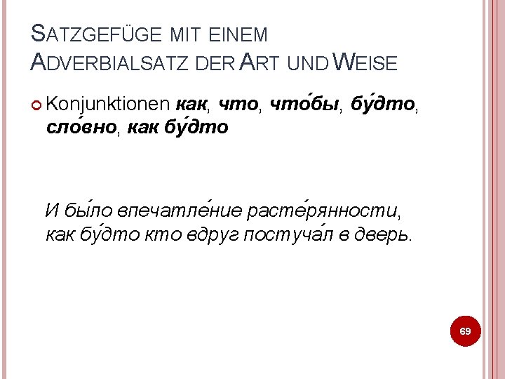 SATZGEFÜGE MIT EINEM ADVERBIALSATZ DER ART UND WEISE Art und Weise, wie sich die Handlung im Hauptsatz vollzieht Fragen как? каки м о бразом? 68