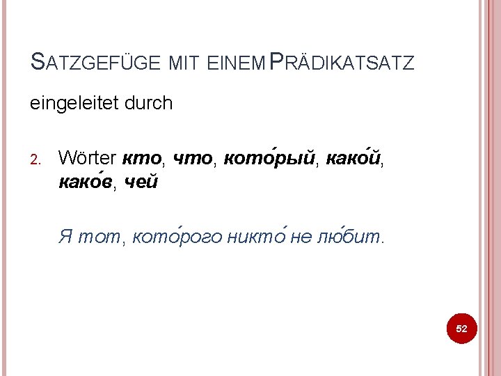 SATZGEFÜGE MIT EINEM PRÄDIKATSATZ eingeleitet durch 1. Pronomen тот, тако й, тако в, всë Хозя ин – тот, кто труди тся. 51