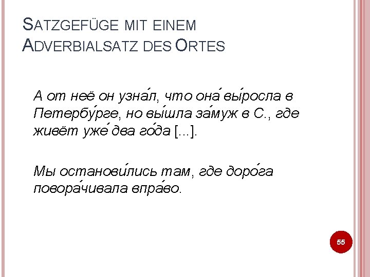 SATZGEFÜGE MIT EINEM ADVERBIALSATZ DES ORTES Ort oder Richtung der Handlung im Hauptsatz Fragen где? ку да? отку да? durch Wörter где, ку да, отку да, там, туда , отту да eingeleitet 54