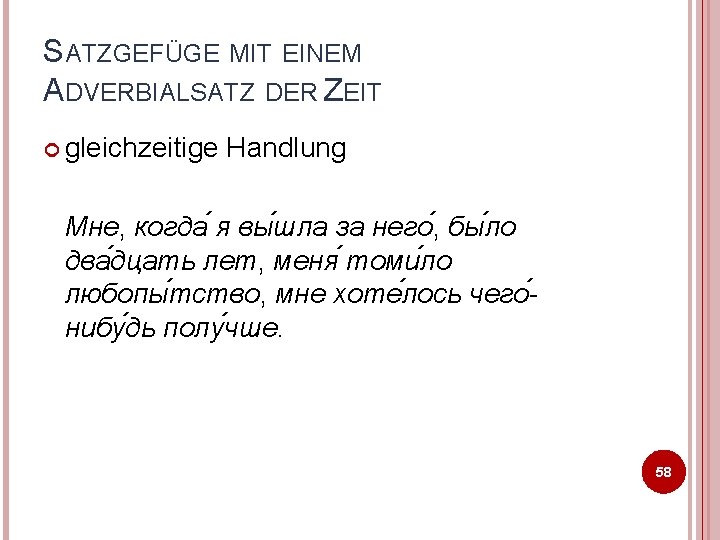 SATZGEFÜGE MIT EINEM ADVERBIALSATZ DER ZEIT 1. gleichzeitige Handlung im Hauptsatz und im Nebensatz Konjunktionen когда , в то вре мя как, пока , по ме ре того как 57