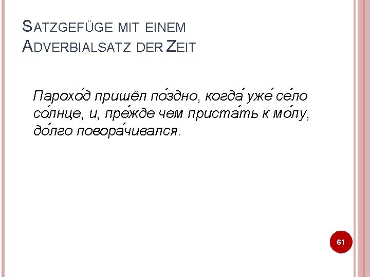 SATZGEFÜGE MIT EINEM ADVERBIALSATZ DER ZEIT 3. die Handlung des Hauptsatzes vor der Handlung des Nebensatzes Konjunktionen пре жде чем, пе ред тем как, до того как 60