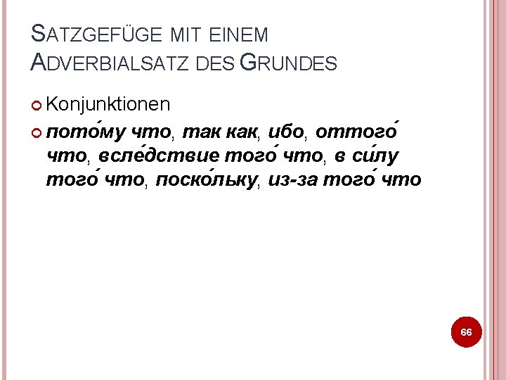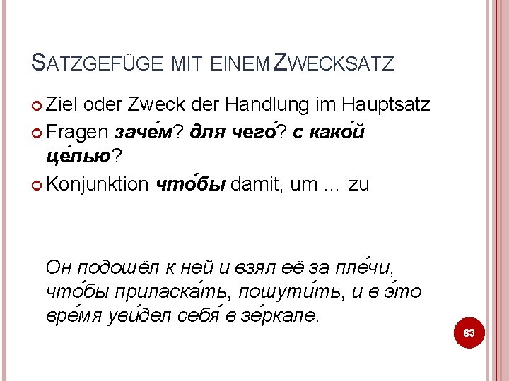 SATZGEFÜGE MIT EINEM ADVERBIALSATZ DER ZEIT 3. die Handlung des Hauptsatzes vor der Handlung des Nebensatzes Konjunktionen пока не, до тех пор, пока не Я броди л до тех пор, пока со лнце не ушло за горизо нт. 62
