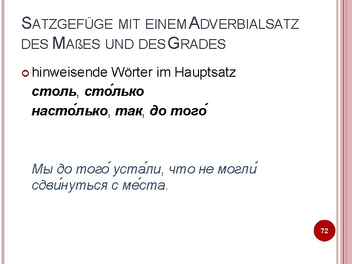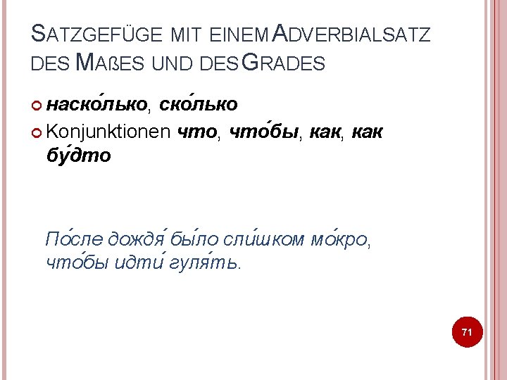 SATZGEFÜGE MIT EINEM ADVERBIALSATZ DES MAßES UND DES GRADES Maß und Grad einer Handlung oder Qualität Fragen как? наско лько? в како й ме ре? в како й сте пени? ско лько? 70