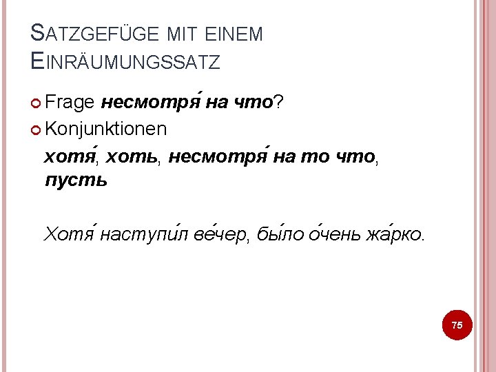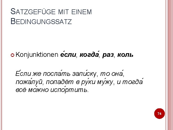 SATZGEFÜGE MIT EINEM BEDINGUNGSSATZ Bedingung der im Hauptsatz genannten Handlung Frage при како м усло вии? 73