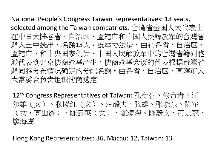 Local People’s Congress Elections – Independent Candidates There a small number of independent candidates for people's congress, particularly in neighborhoods of major cities, who sometimes campaign using weibos posted on the internet. Independent candidates are strongly discouraged and face government intervention in their campaigns. 中国基层人大换届中的“独立参选人”- a Voice of American report http: //www. voachinese. com/content/article-20120103 -independentcandidate-china-136582243/792534. html