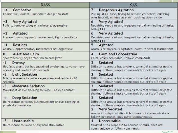 C: Choice of analgesia and sedation Goal-directed delivery of psychoactive medications to: PAD guidelines recommend: • Richmond Agitation-Sedation Scale (RASS) • Riker Sedation-Agitation Scale (SAS). SAS has 7 individual tiers ranging from “ 1” (unarousable) to “ 7” (dangerous agitation). RASS is a 10 -point scale, • • four levels of escalating agitation (RASS +1 to +4) one level denoting a calm and alert state (RASS 0), three levels of sedation (RASS -1 to – 3) two levels of coma (RASS -4 to -5).