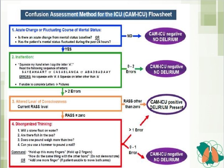 D: Delirium: Assess, Prevent, and Manage • Confusion Assessment Method for the Intensive Care Unit (CAM-ICU, ) and the Intensive Care Delirium Screening Checklist (ICDSC) are the most frequently employed tools to diagnose delirium in ICU CAM-ICU is composed by four features • 1) acute onset of mental status changes or fluctuating course • 2) inattention • 3) disorganized thinking • 4) altered level of consciousness. Patient is considered CAM positive and, so delirious, if he/she manifests both features 1 and 2, plus either feature 3 or 4.