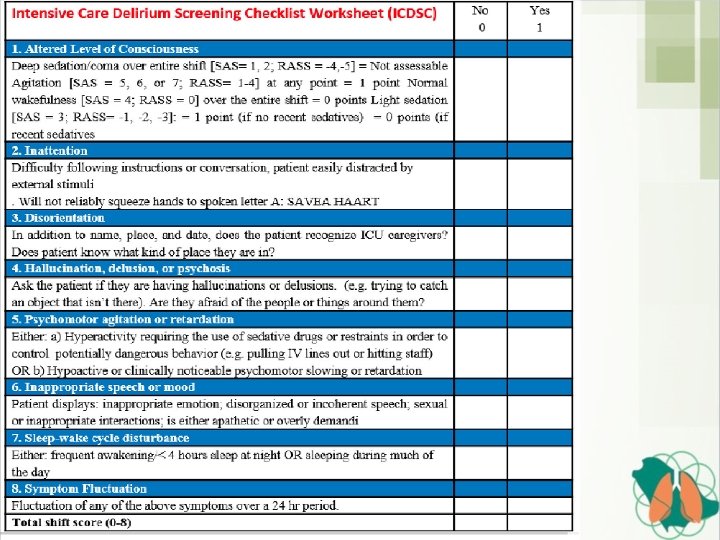 D: Delirium: Assess, Prevent, and Manage • Confusion Assessment Method for the Intensive Care Unit (CAM-ICU, ) and the Intensive Care Delirium Screening Checklist (ICDSC) are the most frequently employed tools to diagnose delirium in ICU • ICDSC checklist is an eight-item screening tool (one point for each item) that is based on DSM criteria and applied to data that can be collected through medical records or to information obtained from the multidisciplinary team.