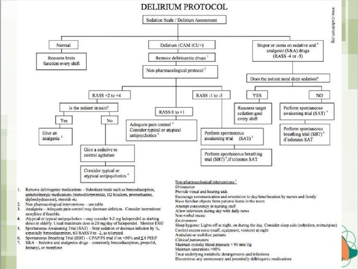 A: Assess, Prevent, and Manage Pain Assessment of pain • 1 st step before administering pain relief. • Only in 35% of the time before ICU procedures!! • Patient's self-report of pain using a 1– 10 numerical rating scale (NRS) is gold standard • High interrelation between delirium and pain: • assessing and treating pain could be important in the prevention and/or management of delirium