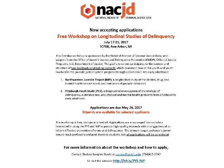 National Archive of Criminal Justice Data: Archiving Orientation for OJJDP Research Grantees May 4, 2017 Barbara Tatem Kelley, OJJDP Social Science Analyst and NACJD Program Manager Chelsea Samples-Steele, ICPSR NACJD User Experience Coordinator Justin Noble, ICPSR Acquisitions Manager