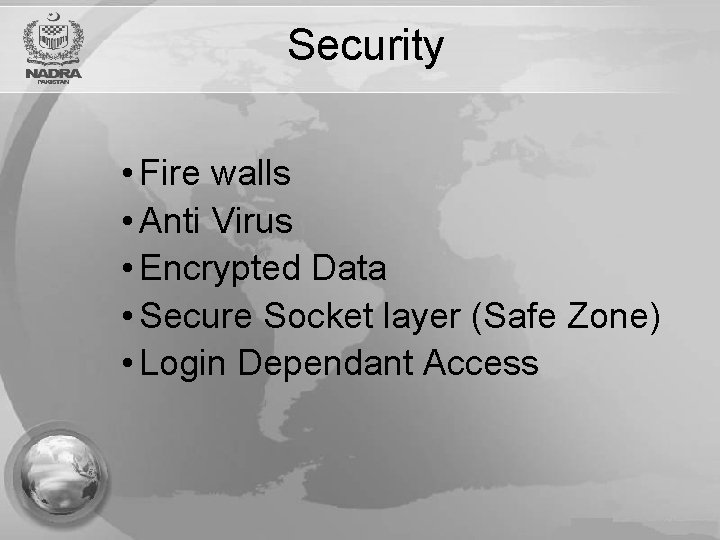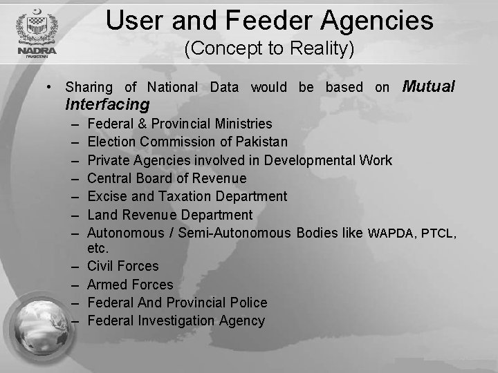 User and Feeder Agencies (Concept to Reality) • Sharing of National Data would be based on Mutual Interfacing – – – Federal & Provincial Ministries Election Commission of Pakistan Private Agencies involved in Developmental Work Central Board of Revenue Excise and Taxation Department Land Revenue Department Autonomous / Semi-Autonomous Bodies like WAPDA, PTCL, etc. Civil Forces Armed Forces Federal And Provincial Police Federal Investigation Agency