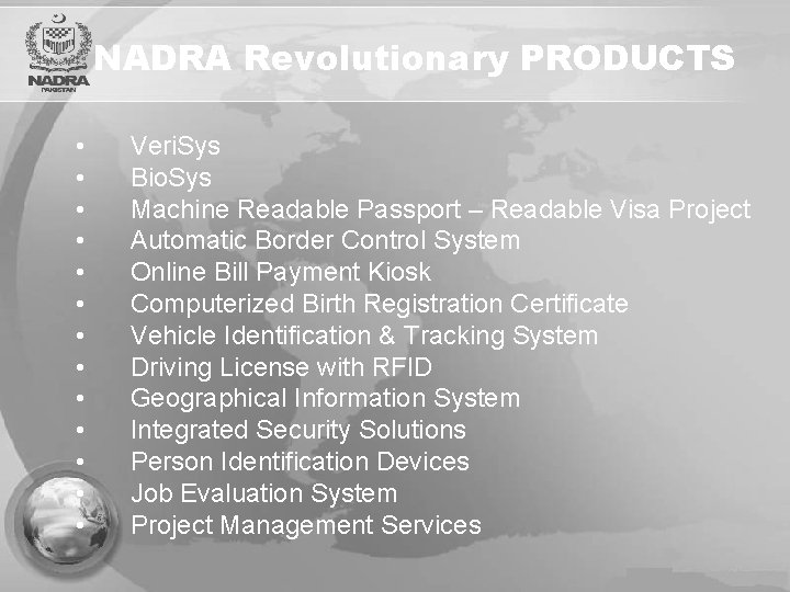 NADRA Revolutionary PRODUCTS • • • • Veri. Sys Bio. Sys Machine Readable Passport – Readable Visa Project Automatic Border Control System Online Bill Payment Kiosk Computerized Birth Registration Certificate Vehicle Identification & Tracking System Driving License with RFID Geographical Information System Integrated Security Solutions Person Identification Devices Job Evaluation System Project Management Services