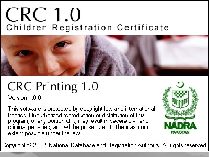 Products & Projects • Current Products – – – Computerized National ID Cards (CNIC) National ID Cards for Overseas Pakistanis (NICOP) Pakistan Origin Card (POC) Children Registration Certificate (CRC) Machine Readable Passports (MRP) Vehicle Identification and Monitoring System (VIMS) • Projects – – – – National Data Warehouse Swift Registration Centers Electoral Rolls Billing Machines (KIOSK) Geographical Information Systems Network Information Infrastructure Earthquake Affected Registration