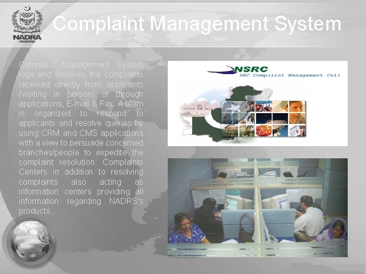 Complaint Management System logs and resolves the complaints received directly from applicants (visiting in person) or through applications, E-mail & Fax. A team is organized to respond to applicants and resolve queries by using CRM and CMS applications with a view to persuade concerned branches/people to expedite the complaint resolution. Complaints Centers in addition to resolving complaints also acting as information centers providing all information regarding NADRS’s products.