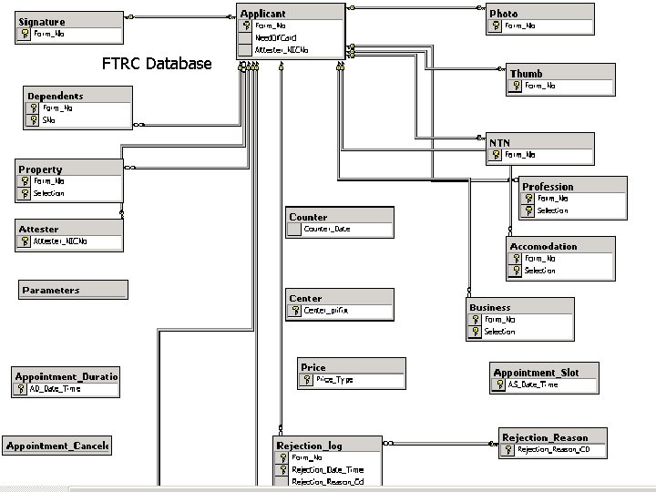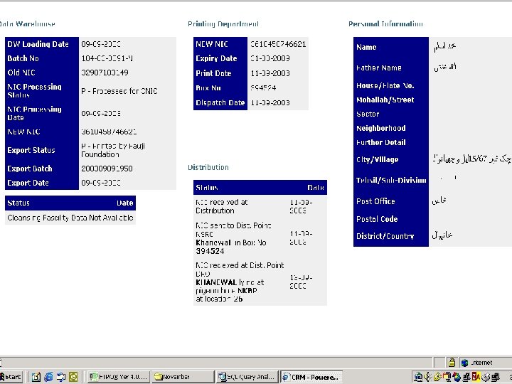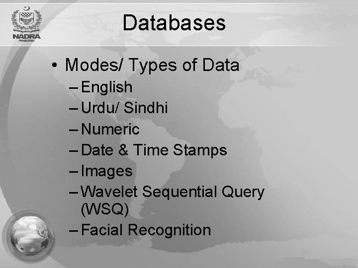 Databases • Modes/ Types of Data – English – Urdu/ Sindhi – Numeric – Date & Time Stamps – Images – Wavelet Sequential Query (WSQ) – Facial Recognition