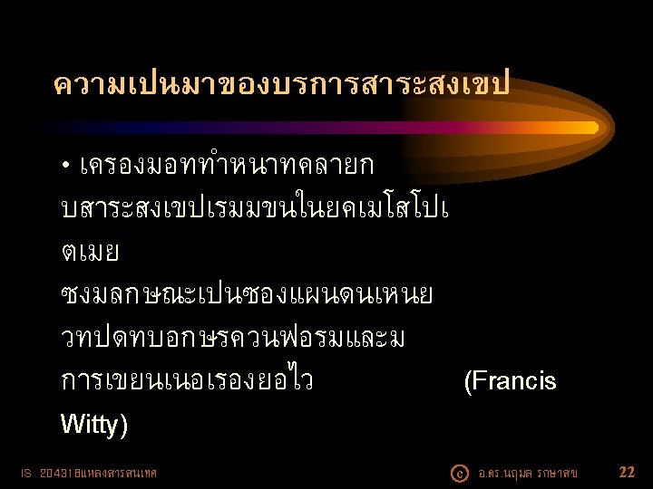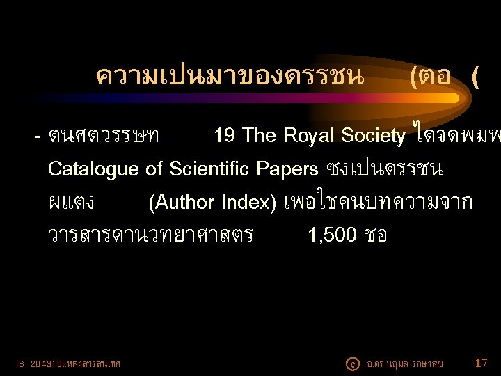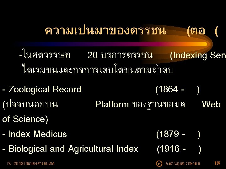 ความเปนมาของดรรชน (ตอ ( - Applied Science and Technology Index (1958 - ) (https: //www. ebscohost. com/academic/appliedscience-technology-index) - Science Citation Index (1961 - ) )ปจจบนอยบน Platform ของฐานขอมล Web of Science) IS 204318แหลงสารสนเทศ c อ. ดร. นฤมล รกษาสข 19