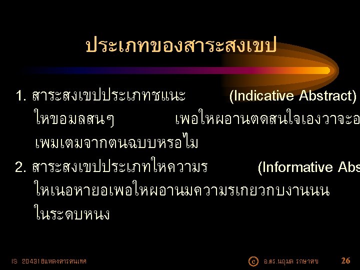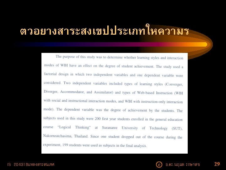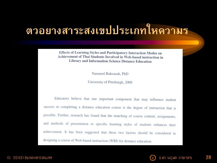• ปจจบนบรการสาระสงเขปใหบรการในร ปฐานขอมลออนไลน - OCLC - EBSCO -- Academic Search Complete -- Computers & Applied Science Complete - Pro. Quest --Library and Information Science Abstracts (LISA) IS 204318แหลงสารสนเทศ c อ. ดร. นฤมล รกษาสข 24
