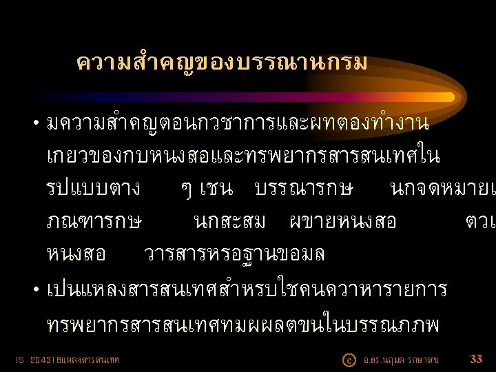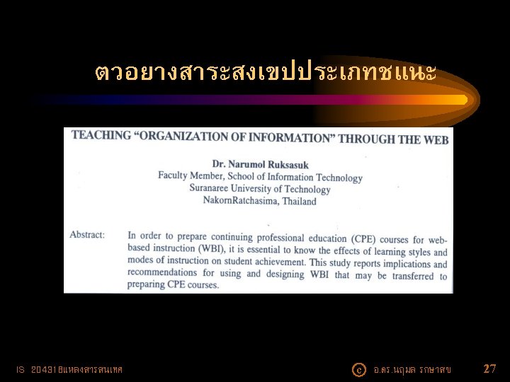 What is an Annotated Bibliography? • An annotated bibliography is a list of citations to books, articles, and documents. Each citation is followed by a brief (usually about 150 words) descriptive and evaluative paragraph, the annotation. The purpose of the annotation is to inform the reader of the relevance, accuracy, and quality of the sources cited. (http: //guides. library. cornell. edu/) IS 204318แหลงสารสนเทศ c อ. ดร. นฤมล รกษาสข 52