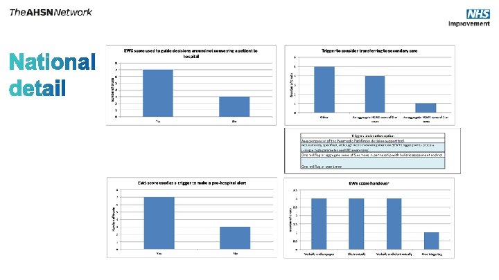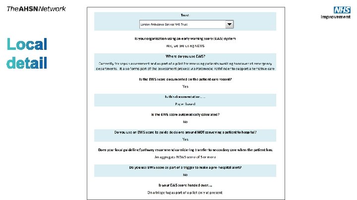 Ø Of 10 trusts, all report using NEWS in all or part of the trust Ø 8 report using NEWS across all parts of the organisation Ø 2 trusts report using NEWS in specific pathways only; both organisations identified sepsis as a the pathways for which NEWS is used Ø 90% of the organisations record NEWS on the patient care record Ø 56% of organisations answering the question use electronic systems, 22% a mix of paper and electronic systems and 22% use paper based systems only to calculate and record NEWS. However, of the 9 organiastions answergin the follow up question only 2 report the score being calculated automatically. Ø 70% of organisations report using NEWS to guide decisions relating to conveyance; in response to the follow up question: Ø 4 cited a aggregate NEWS score of 5 or more to trigger transfer to secondary care Ø 1 cited an aggregate NEWS score or 3 or more to trigger transfer to secondary care Ø 5 identified ‘other’ triggers which included “NEWS as a component of the Paramedic Pathfinder decision support tool’ and ‘One red flag or aggregate score of 5 or more in partnership with holistic assessment and not in isolation’ Ø 70% of organisations reported using NEWS as a trigger to make a pre-hospital alert Ø There was a mix of approaches to ‘handover’ of NEWS scores; 30% verbally/on paper, 30% electronically, 30% mix of verbal and electronic and 10% on triage tag.