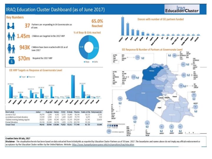 Sub-National meetings • Centre South: 1 st August, 10 am, NCCI Baghdad • Dahuk: 8 th August, 10 am, at Do. E office • Erbil: 23 rd July, 9 am, SCI office • Kirkuk: 13 th July, 10. 30 am, SCI office • Sulaymaniyah: 18 th July, 10 am, Do. E office • Tikrit: 25 th July, 11 am, Sorouh office www. humanitarianresponse. info/en/operations/iraq/education/events
