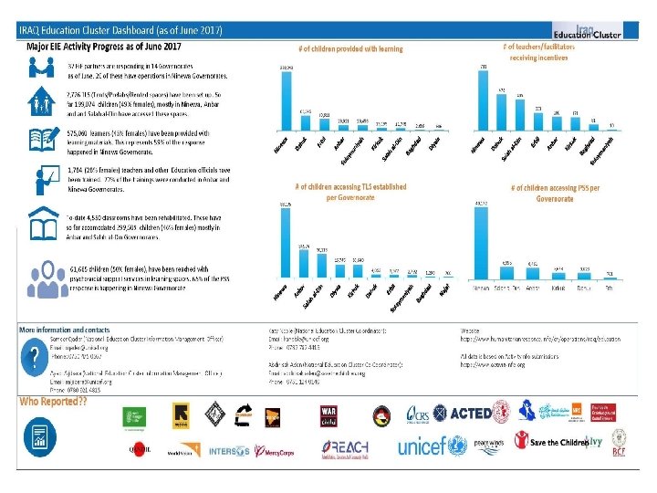 National Education Cluster meeting Monday 10 th July 2017 kanoble@unicef. org 07827 824 415 Skype – Katy. Noble. HST Abdirisak. Aden@savethechildren. org 07511 240 140 Skype – Abdirisak 09 iraq. edu@humanitarianresponse. info Skype – Fredrik. telle 1 iraq. edu. im@humanitarianresponse. info Skype – mugabi-fred sqader@unicef. org 0750 475 0567 Skype – Samirizzat aaljibara@unicef. org 0780 921 4815 Skype – ashihan