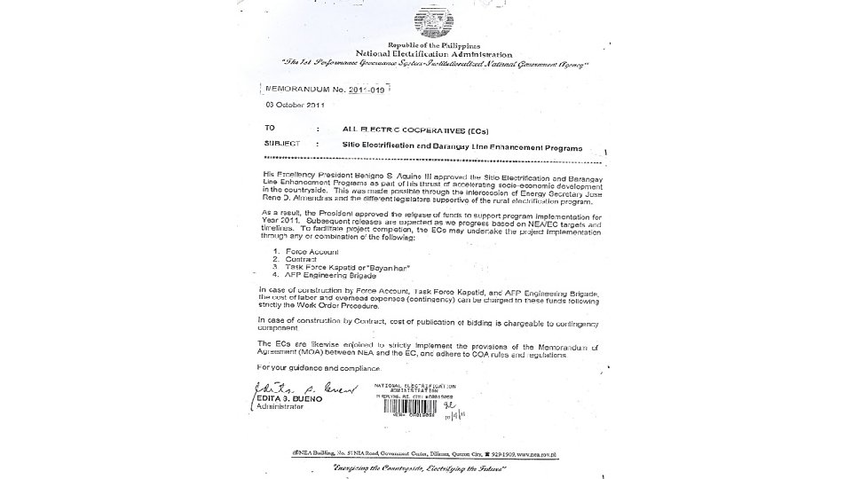 National Electrification Administration www. nea. gov. ph “The 1 st Performance Governance System-Institutionalized National Government Agency” Memo to All ECs re Compliance to COA Audit Findings on Subsidy Funded Projects " Energizing the Countryside, Electrifying the Future"