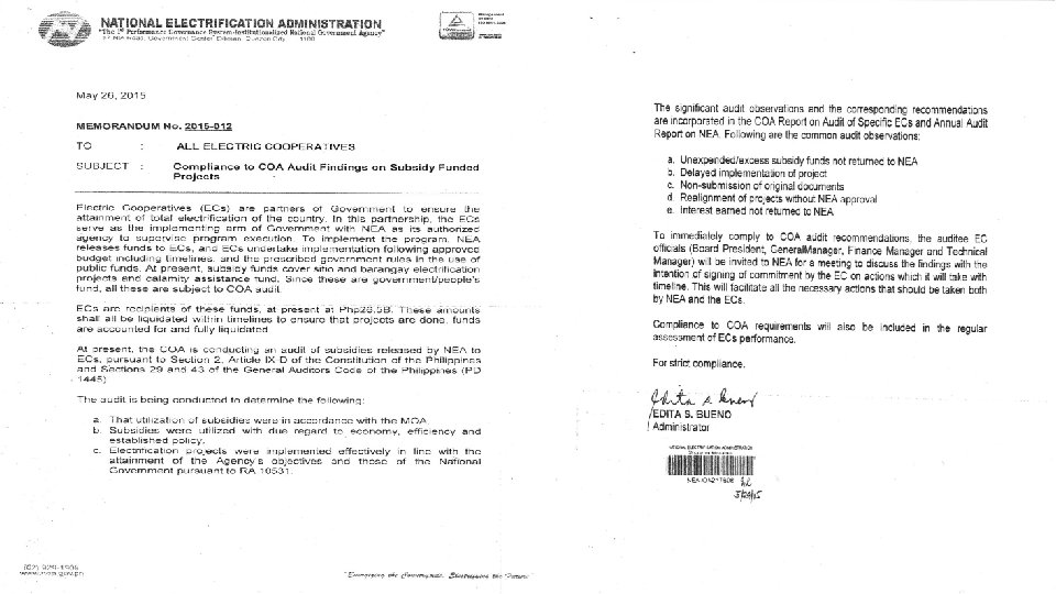 National Electrification Administration www. nea. gov. ph “The 1 st Performance Governance System-Institutionalized National Government Agency” Memo to All ECs re Compliance to COA Audit Findings on Subsidy Funded Projects " Energizing the Countryside, Electrifying the Future"
