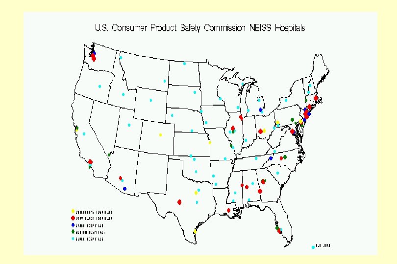 NEISS Hospital Sample • Universe - 5000 hospitals in 5 Strata • CPSC Sample - 98 hospitals selected randomly from all strata • All Injury Sample - 64 hospitals selected randomly from the 98