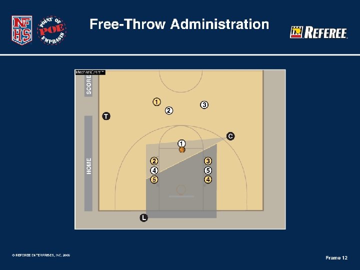 Free-Throw Administration § Appropriate free-throw positioning by the officials will assist in proper penalty enforcement. • Lead is approximately 4 feet from near lane line for ALL free throws. • Center is halfway between the near lane line and the sideline; just above the freethrow line extended. • Trail is at approximately the 28 -foot mark and just inside the tableside boundary line – NOT at the division line.