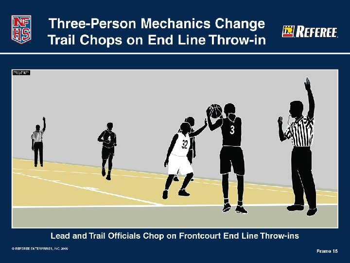 Trail Mirrors Lead’s ‘Chop’ (3) § Three-person crews only. § When the lead is administering frontcourt end line throw-ins, the trail will now mirror the lead’s stop- and start-clock (chop) signal. § This helps the timer to accurately start the clock when his/her view of the lead is obscured.
