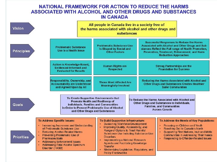 Considerations § § § Need for federal leadership, not ownership Need for a national plan, not an expansion of Canada’s Drug Strategy Ensure the contribution of many federal partners Seek commitment from numerous provincial, territorial, municipal, Aboriginal, and NGO stakeholders at various stages of readiness, levels of trust and with potentially very different philosophies Get buy-in where there is no promise of new funding, only the potential to better leverage existing funds Gauge the right pace - process – key to success
